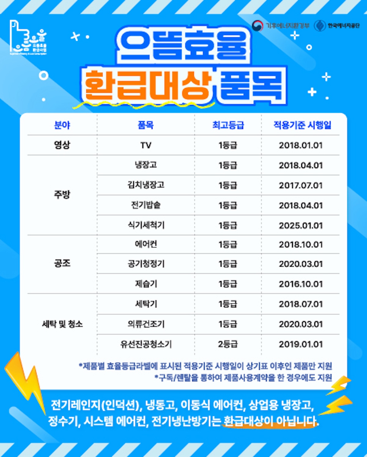 환급을 받을 수 있는 품목은 가정에서 흔히 사용하는 필수 가전 11개다. TV, 냉장고, 김치냉장고, 세탁기, 의류건조기, 에어컨, 식기세척기, 공기청정기, 제습기, 전기밥솥이 1등급 제품이어야 하며, 유선 진공청소기는 예외적으로 2등급 제품까지 환급 대상에 포함된다.