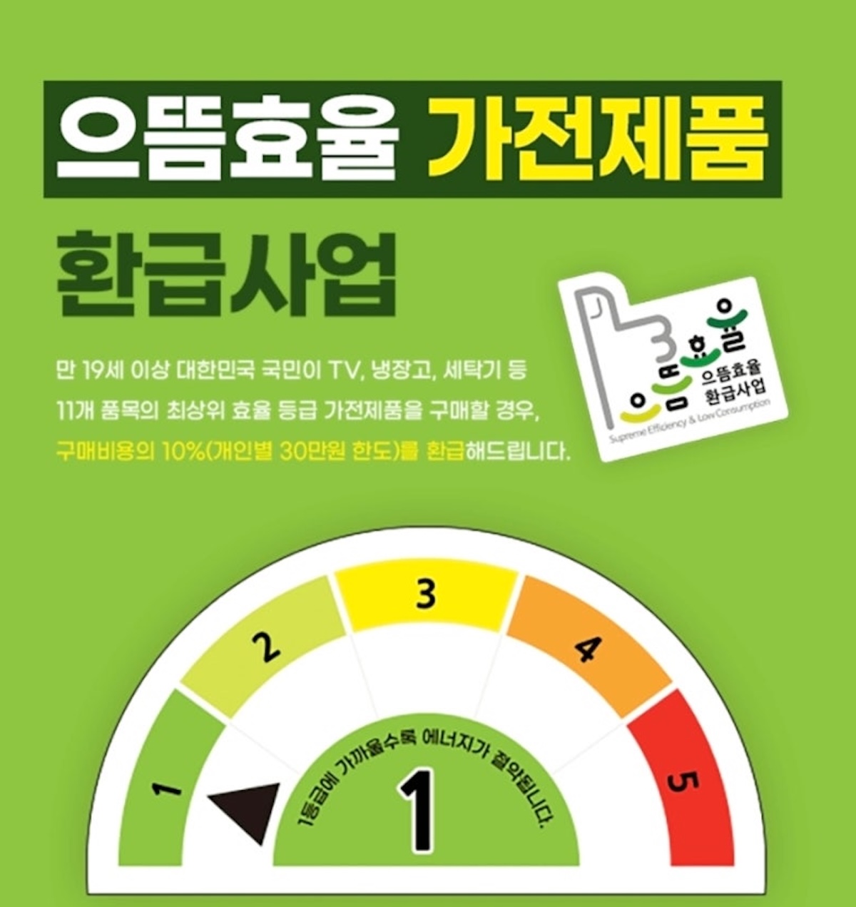 1등급 가전 구매 시 구매액의 10% 환급(최대 30만원)