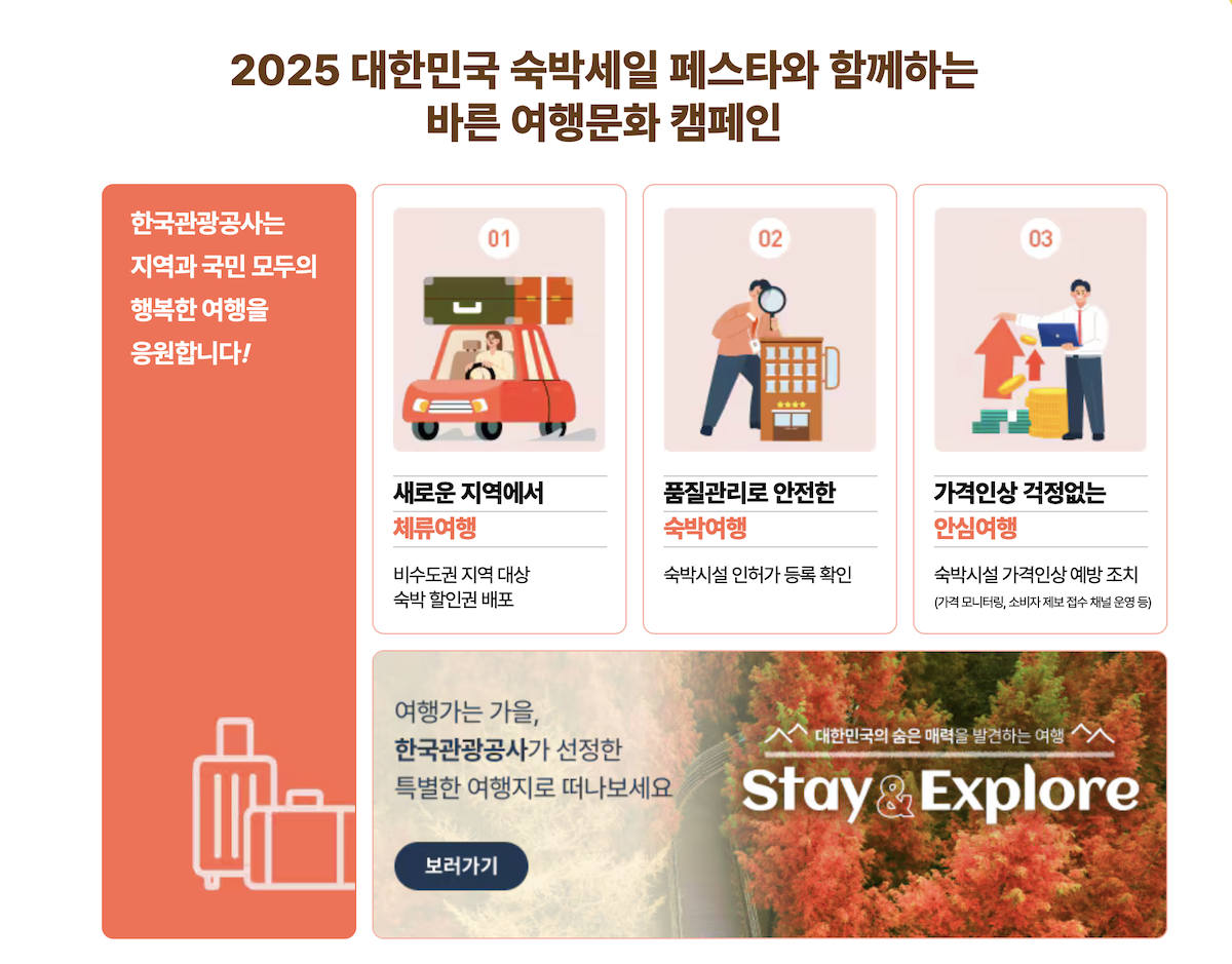 또한, 이번 숙박세일페스타는 ‘코리아 그랜드 페스티벌’ 기간과 겹쳐 여행 경비 전반을 절약할 수 있는 기회를 제공한다. 숙박 쿠폰으로 지방 숙소를 저렴하게 예약하고, 여행지에서는 전통시장 할인, 제휴 식당 할인 등 페스티벌 혜택을 연계해 활용하는 ‘통합 여행’을 설계할 수 있다. 이는 숙박비뿐만 아니라 교통, 식비, 쇼핑 등 여행의 모든 과정에서 지출을 줄일 수 있는 현명한 소비 전략이다.