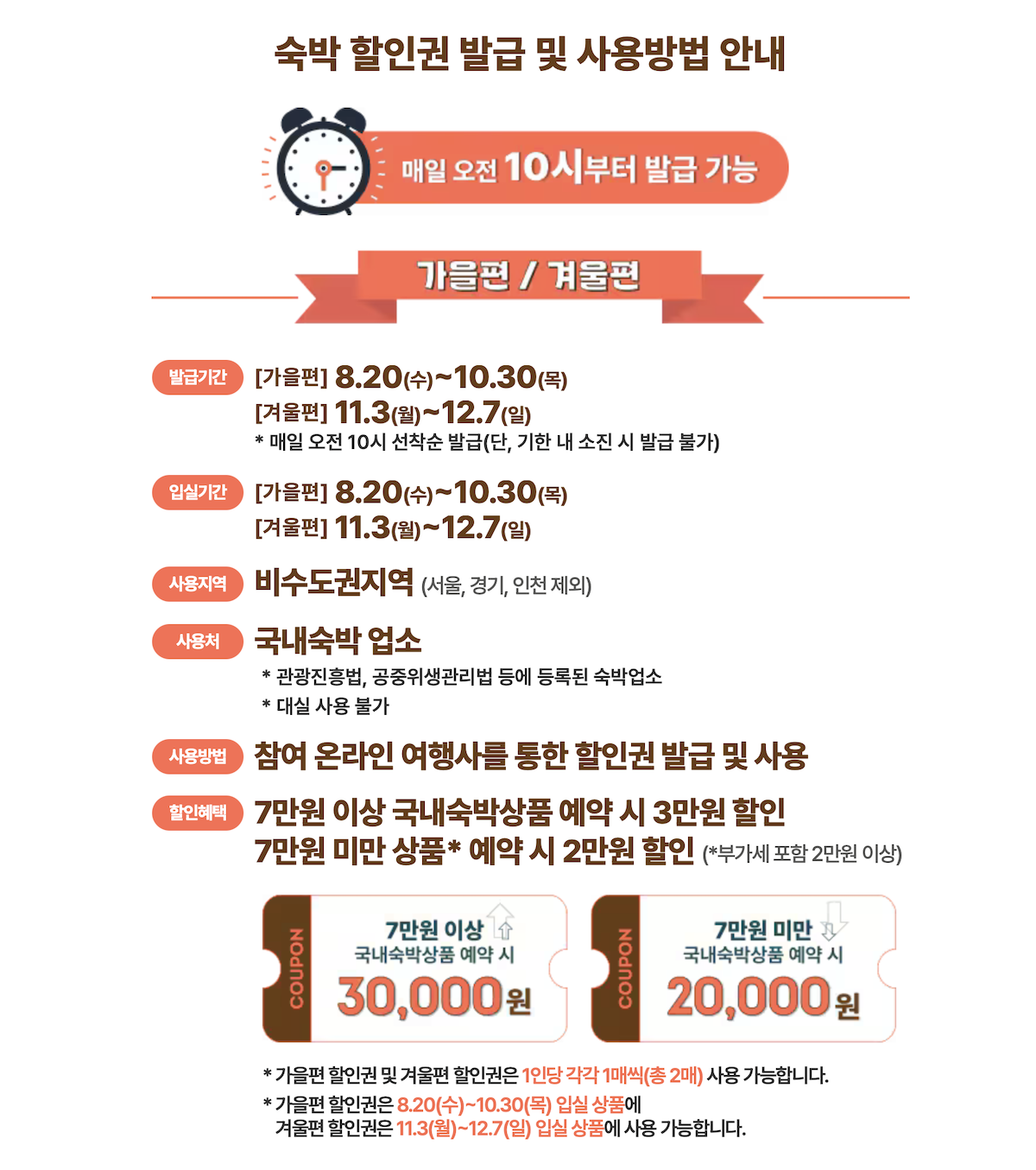 할인 쿠폰은 숙박요금에 따라 두 종류로 나뉜다. 숙박비가 7만 원 이상인 상품을 예약할 경우 3만 원 할인권이, 7만 원 미만 상품에는 2만 원 할인권이 적용된다. 쿠폰은 1인당 1매만 발급받을 수 있으며, 발급받은 당일 오전 10시부터 다음 날 오전 7시까지 사용하지 않으면 자동으로 소멸된다. 다만, 쿠폰을 사용하지 못했더라도 다음 날 오전 10시에 다시 선착순 발급에 도전할 수 있다.