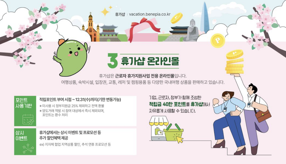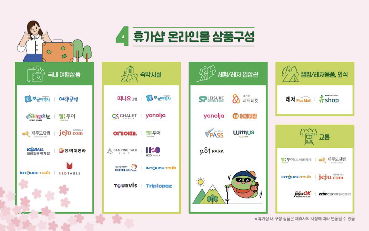 참여 근로자로 선정되면 전용 온라인몰인 ‘휴가샵’에서 40만 원의 포인트를 받아 숙박, 항공, 렌터카, 각종 체험 및 레저 입장권, 패키지여행 등 20만여 개의 국내 여행 관련 상품을 자유롭게 구매할 수 있다. 이는 근로자의 여행 경비 부담을 덜어주는 동시에 국내 관광 소비를 촉진하는 ‘일석이조’의 효과를 낳고 있다 .