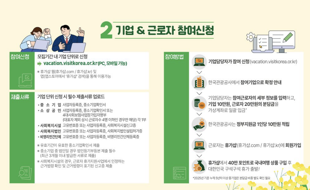 기업이 참여 승인을 받으면, 기업 담당자는 참여 근로자 명단을 제출하고 기업분담금과 근로자분담금을 일괄 납부해야 한다. 모든 절차가 완료되면 개인별로 40만 원의 포인트가 ‘휴가샵’에 적립된다.