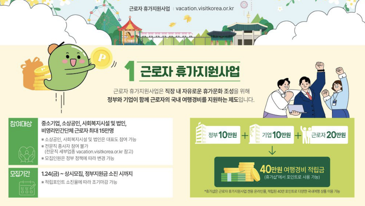 근로자 20만원 내면 기업, 정부가 10만원 지원 총 40만원 국내 여행경비 지원