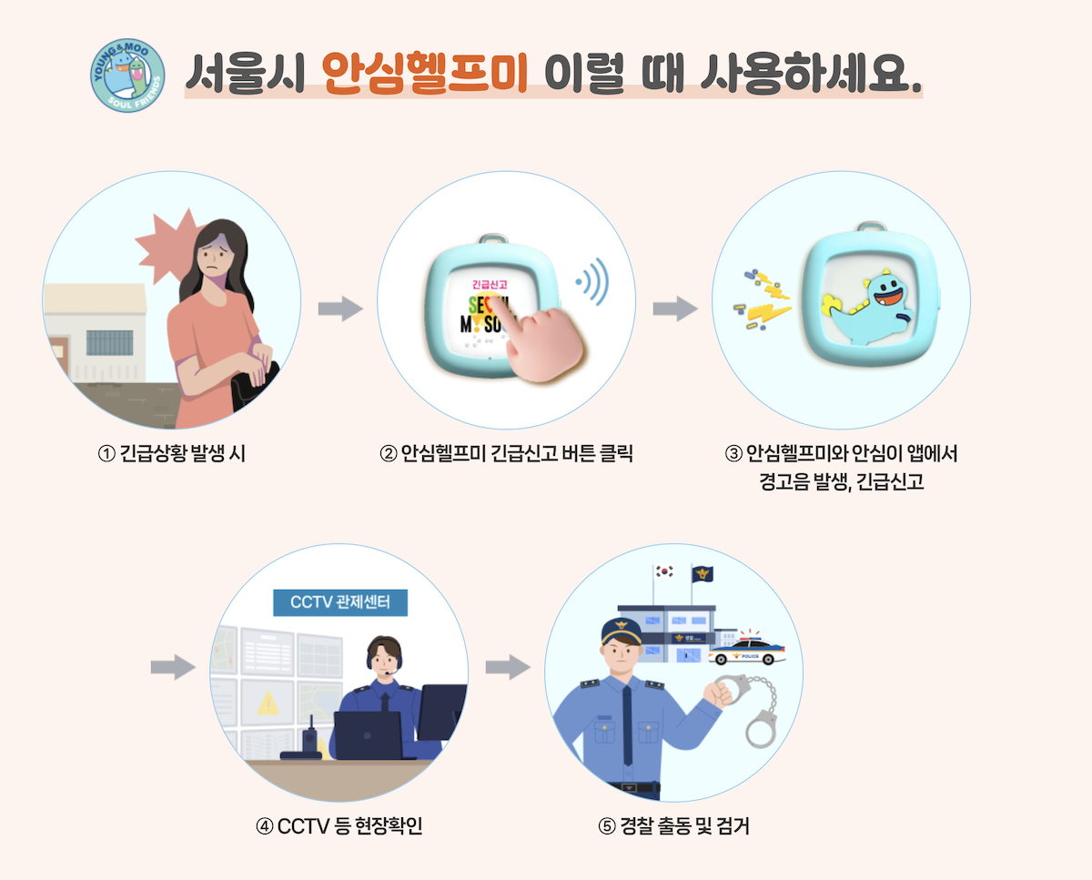 평소 가방 등에 부착하고 다니다 위급상황 시 기기의 긴급신고 버튼을 3초간 누르면, 경고음과 함께 즉시 자치구 CCTV 관제센터로 신고가 접수된다. 관제센터는 신고자 위치 주변 CCTV를 통해 상황을 파악하고, 상주 경찰이 인근 순찰차 출동을 요청하는 등 신속한 초동 조치를 실행한다. 동시에 ‘서울 안심이’ 앱에 미리 지정한 보호자(최대 5명)에게도 현재 위치와 구조요청 내용이 문자메시지로 자동 발송된다.
