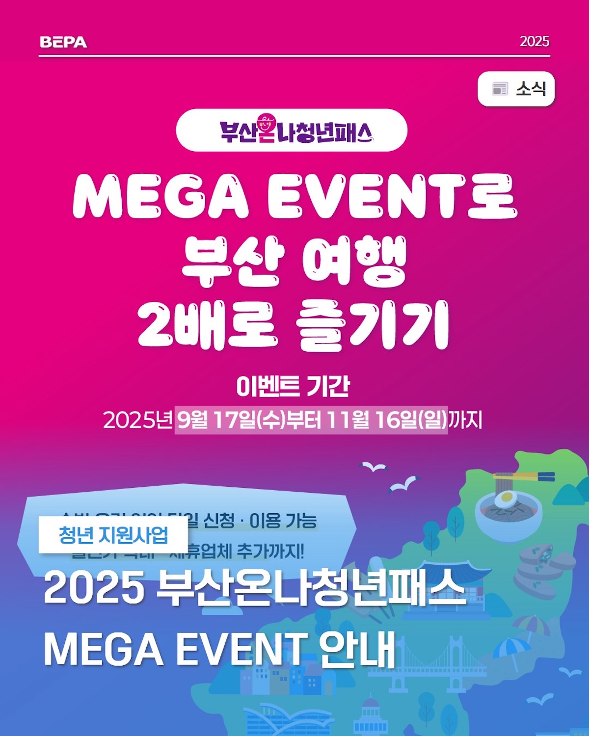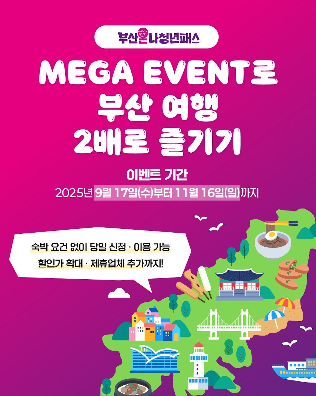 부산국제영화제, 부산불꽃축제, 지스타 등 대한민국을 대표하는 축제가 연이어 열리는 가을을 맞아, 부산시가 타 지역 청년들을 위한 파격적인 혜택을 내놓았다. ‘부산온나청년패스’의 가장 큰 진입 장벽이었던 ‘1박 이상 숙박’ 조건을 11월 16일까지 한시적으로 없애는 ‘메가 이벤트’를 진행하는 것이다. 이에 따라 숙박 부담 없이 당일치기로 부산을 찾는 청년들도 주요 관광지와 식음료 매장에서 최대 60%에 달하는 할인을 받을 수 있게 됐다.