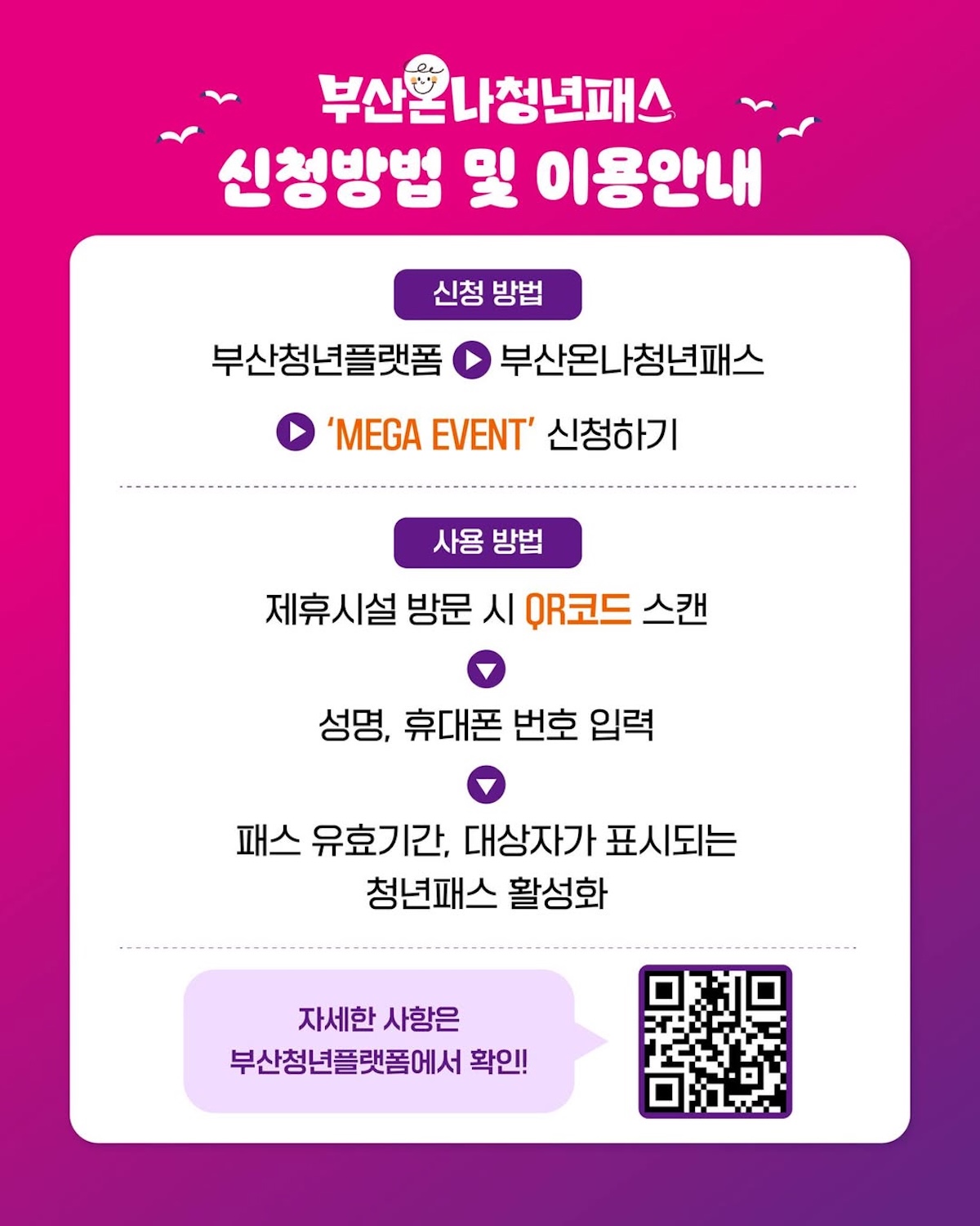 신청 방법 또한 대폭 간소화됐다. 부산시가 운영하는 ‘부산청년플랫폼’ 홈페이지에 접속하여 별도의 회원가입 없이 본인 인증만으로 신청할 수 있다. 특히 ‘메가 이벤트’ 기간에는 신청 즉시 모바일 QR코드 형태의 패스가 발급되어, 축제 현장에 도착해서 바로 신청하고 사용하는 것도 가능하다. 다만, 11월 17일부터는 기존 정책으로 돌아가 숙박 증빙 서류를 제출해야 하며, 관리자 승인에 시간이 소요되므로 최소 방문 2일 전(주말·공휴일 제외)까지 신청을 마쳐야 한다.